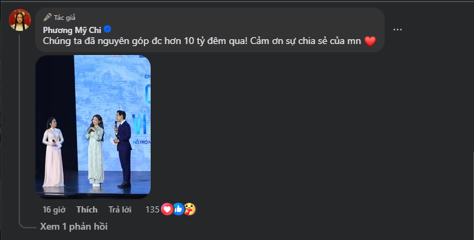 Chỉ ít lâu sau, nữ ca sĩ tiếp tục mang đến tin vui cho người hâm mộ: chương trình đã quyên góp được hơn 10 tỷ đồng, toàn bộ số tiền này sẽ được chuyển đến người dân các tỉnh bị ảnh hưởng nặng nề bởi bão Bualoi để hỗ trợ khắc phục thiệt hại. Phương Mỹ Chi bày tỏ niềm xúc động trước sự chung tay mạnh mẽ của các nghệ sĩ và khán giả trên khắp cả nước.