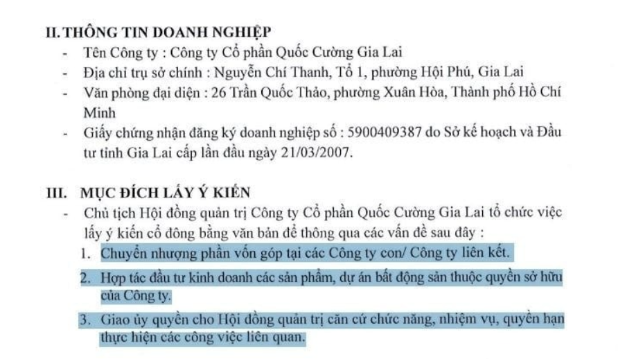 Chủ trương thoái vốn tại hai công ty này đã được Đại hội đồng cổ đông Quốc Cường Gia Lai thông qua vào ngày 17/12, nhằm phục vụ cho việc thanh toán khoản nợ theo bản án, quyết định đã có hiệu lực pháp luật của Tòa án trong vụ án Trương Mỹ Lan.