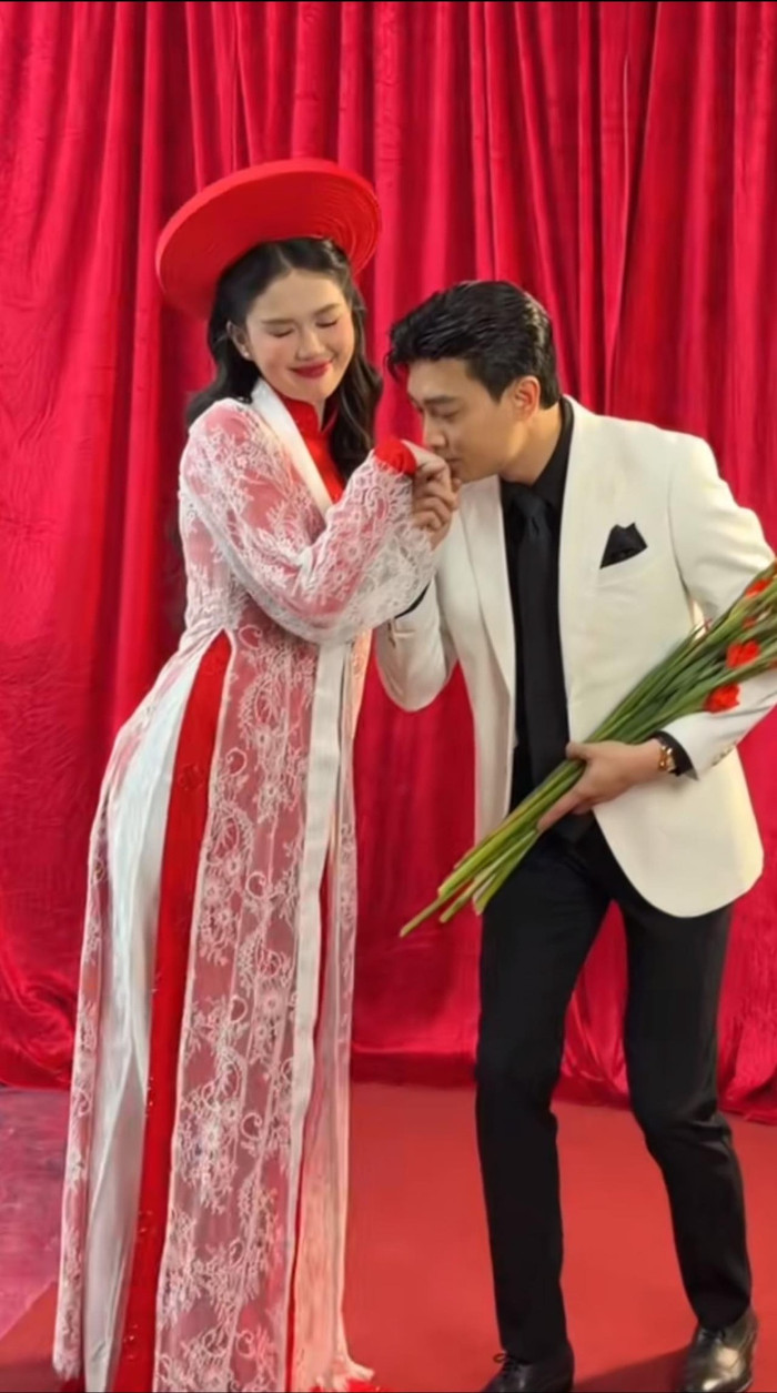 Mới đây, loạt ảnh hậu trường ghi lại khoảnh khắc Quốc Trường và Ngọc Trinh chụp ảnh theo phong cách cô dâu - chú rể nhanh chóng thu hút sự quan tâm của cộng đồng mạng. Trong những bức hình được chia sẻ, cả hai diện trang phục cưới, tạo dáng thân mật và thoải mái trước ống kính.