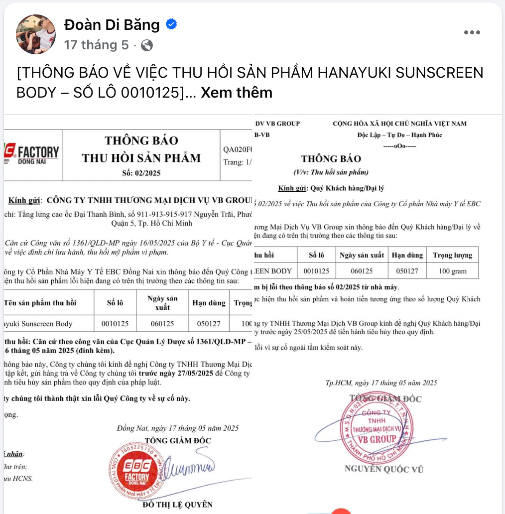 Cụ thể, ngày 17/5, Đoàn Di Băng đăng thông báo thu hồi sản phẩm kem chống nắng toàn thân Hanayuki Sunscreen Body, số lô 0010125. Sản phẩm do Công ty TNHH EBC Giang Điền - Nhà máy Y tế EBC Đồng Nai sản xuất. EBC đã thừa nhận sai sót trong quy trình và ghi nhãn, cam kết rà soát, khắc phục.
