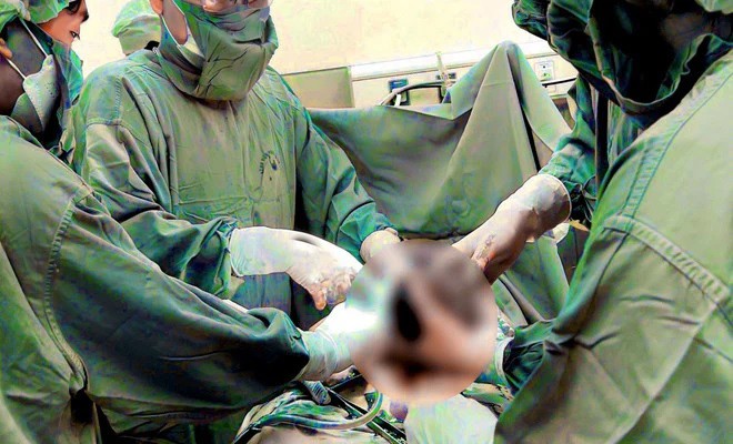 Đột nhiên, sản phụ xuất hiện mệt mỏi, tím tái toàn thân, khó thở, mạch khó bắt, huyết áp không đo được. Ngay lập tức, các bác sĩ hội chẩn và đưa ra phương án mổ lấy thai, cắt tử cung bán phần để lại phần phụ.
