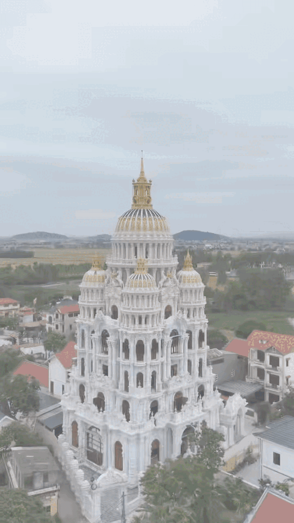 Tòa lâu đài "oách" nhất Bắc Ninh có thiết kế 12 tầng, được bao phủ bởi tông màu vàng kem sang trọng, có giá trị ước tính hàng trăm tỷ đồng. Biệt phủ mang phong cách kiến trúc châu Âu cổ điển, thể hiện rõ qua hệ cột lớn, mái vòm, hành lang và các mảng phù điêu được chạm khắc cầu kỳ. Mỗi chi tiết đều được chăm chút kỹ lưỡng, tạo nên tổng thể vừa cổ kính vừa đậm chất đẳng cấp.