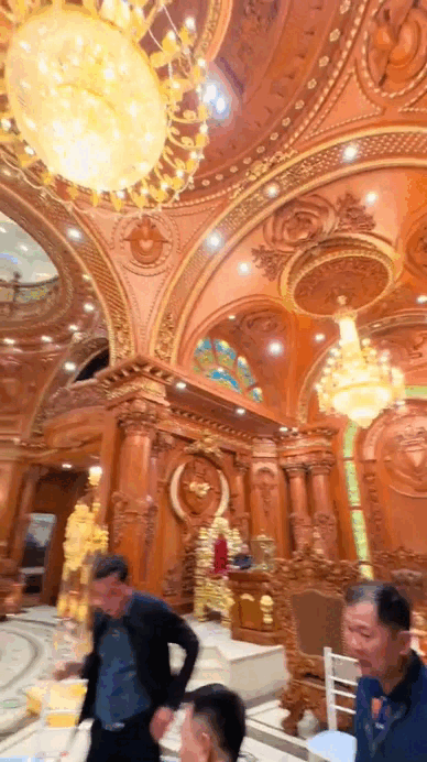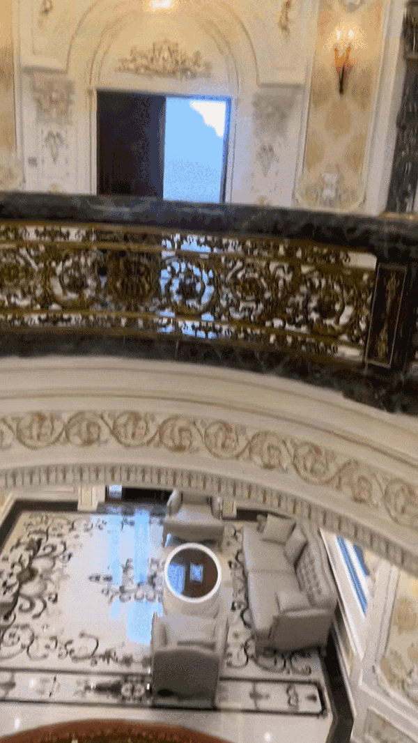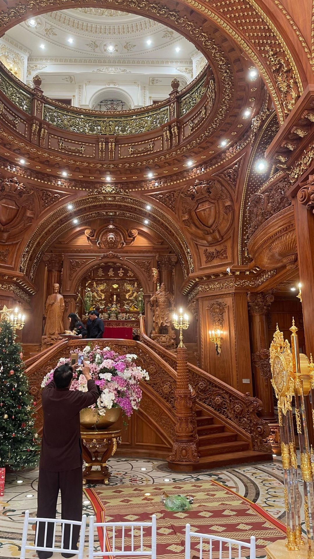 Bên trong tòa lâu đài, nội thất và cách tổ chức không gian tiếp tục gây ấn tượng mạnh. Khu vực thông tầng được thiết kế rộng, với hành lang tròn chạy theo khung công trình, tạo cảm giác liền mạch và bề thế. Phần mái vòm được trang trí bằng tranh và các mảng phù điêu chạm khắc công phu, làm nổi bật phong cách cổ điển châu Âu.