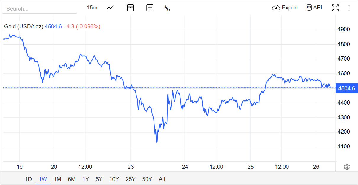 Giá vàng thế giới ổn định trên ngưỡng 4.500 USD/ounce