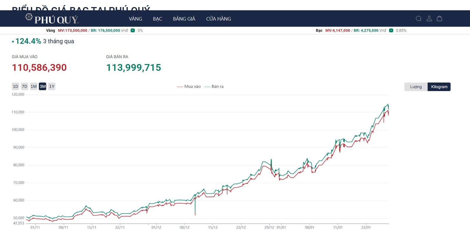 Thông báo ngừng giao dịch sớm được đưa ra trong bối cảnh thị trường bạc đang ghi nhận những biến động kỷ lục về giá trị. Số liệu giao dịch ngày 27/1 cho thấy giá bạc thỏi 1kg tại Phú Quý có thời điểm chạm ngưỡng 114,8 triệu đồng/kg, mức cao nhất trong lịch sử giao dịch của đơn vị này và ghi nhận mức tăng trưởng khoảng 50% chỉ trong vòng một tháng qua.
