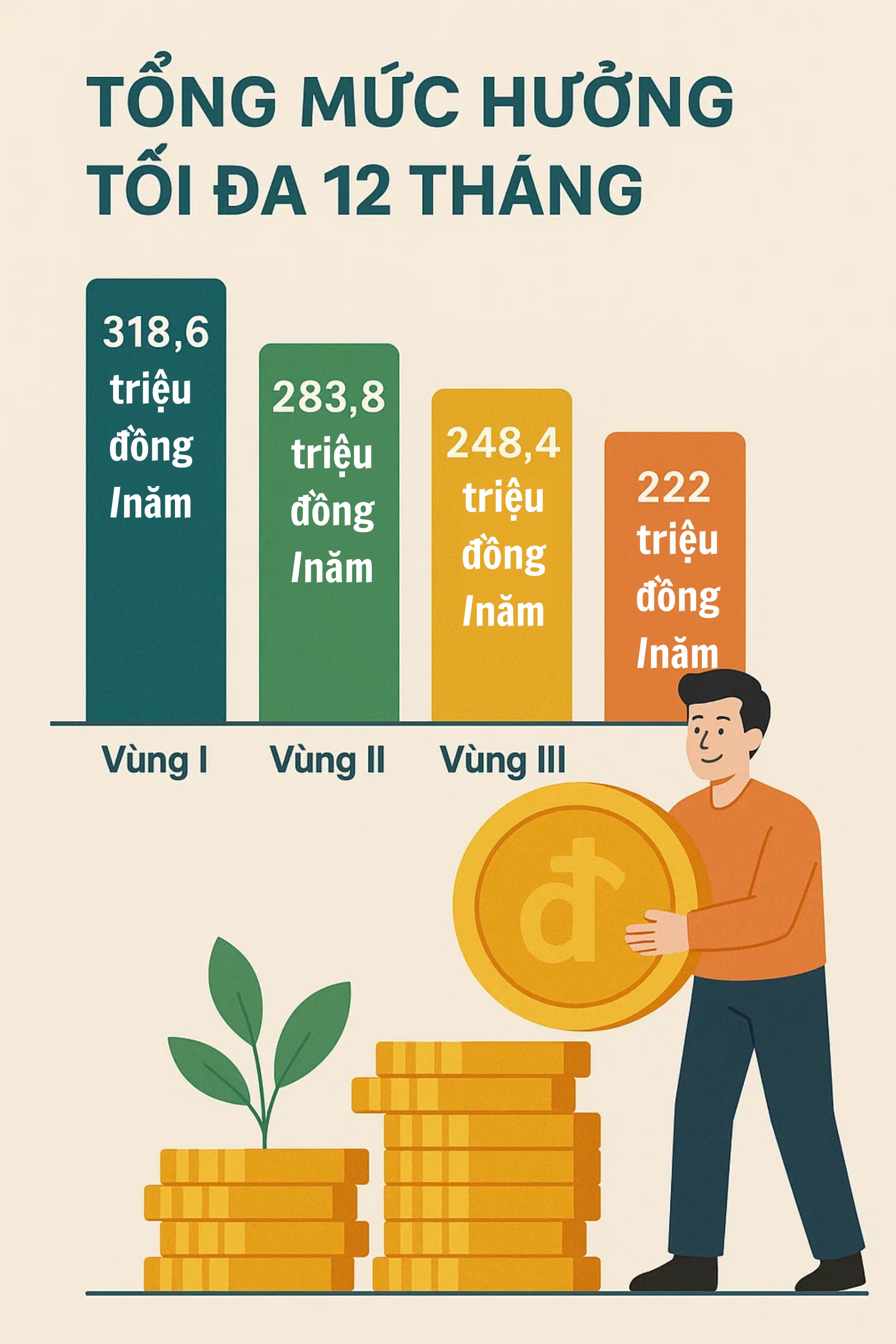 Theo Luật Việc làm 2025, người lao động có thể hưởng tối đa 12 tháng trợ cấp thất nghiệp, tương ứng với 144 tháng đóng bảo hiểm. Nếu đạt điều kiện hưởng tối đa, người lao động ở vùng I có thể nhận 318,6 triệu đồng/năm, tương đương gần 320 triệu đồng. Các vùng khác cũng có mức hưởng tương ứng:
