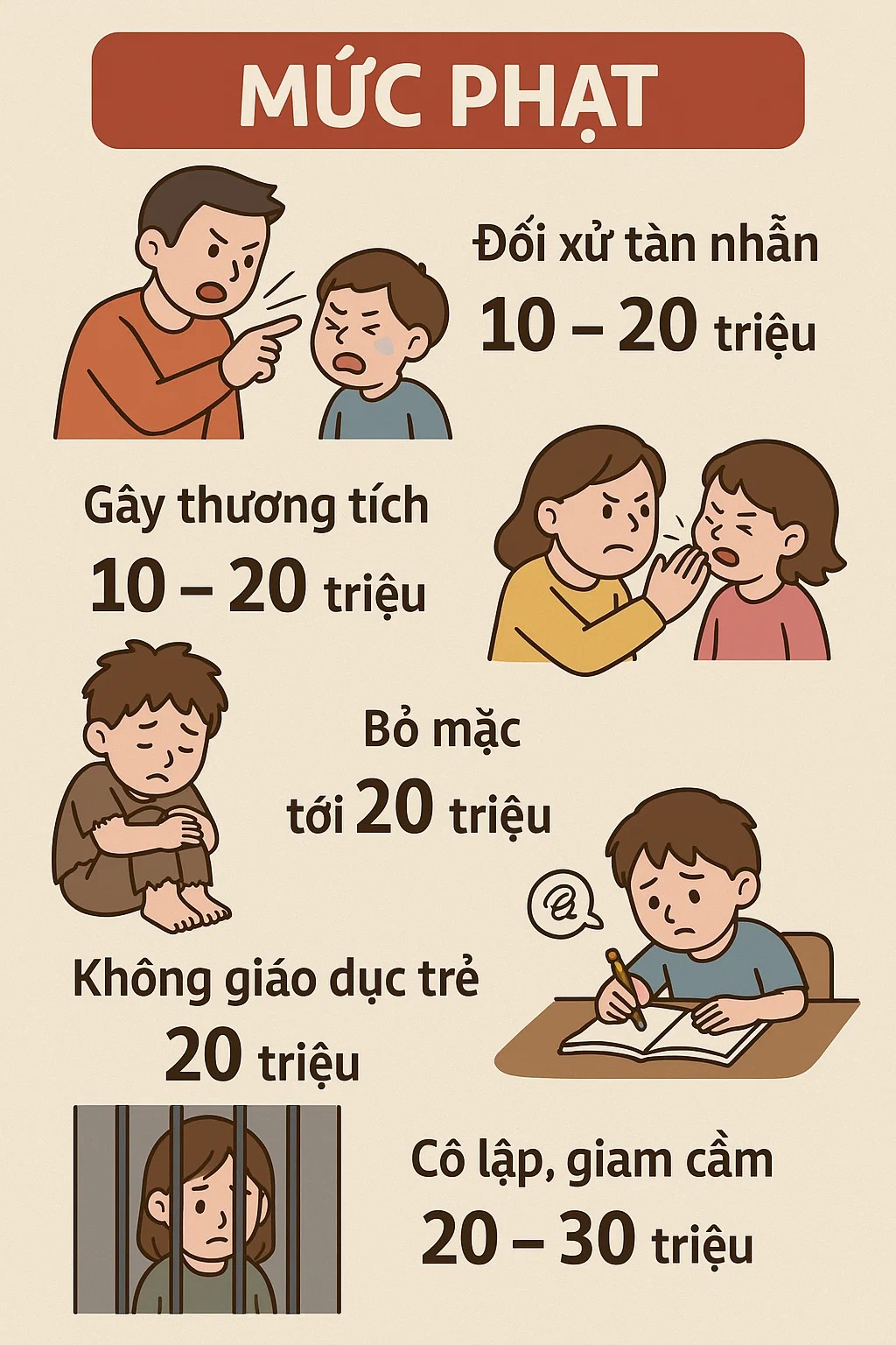 Ngoài ra, hành vi bắt trẻ chứng kiến b:ạo l:ực hoặc tiếp xúc với hình ảnh, âm thanh k:ích đ:ộng b:ạo l:ực sẽ bị phạt nặng hơn, từ 10 đến 20 triệu đồng, thể hiện quyết tâm bảo vệ trẻ em khỏi những tác động tâm lý tiêu cực.