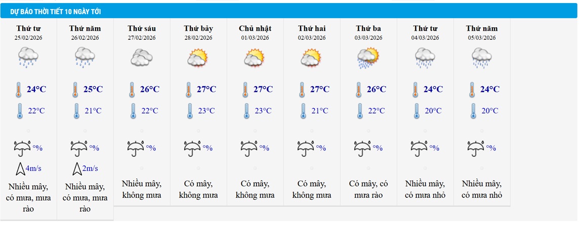 Ngày 25.02: Nhiều mây, không mưa, nhiệt độ 21-25 độ C.