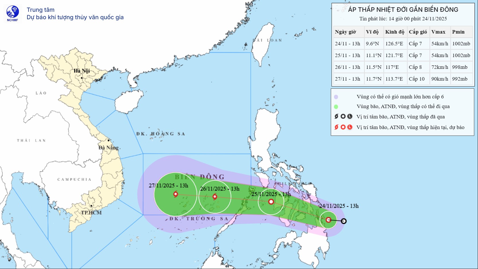 Dự báo đến 13 giờ ngày 25-11, áp thấp nhiệt đới ở khoảng 11,1 độ Vĩ Bắc; 121,7 độ Kinh Đông, trên khu vực miền Trung Philippines. Cường độ dự báo đạt cấp 7, giật cấp 9, di chuyển theo hướng Tây Tây Bắc, tốc độ khoảng 20-25 km/giờ.