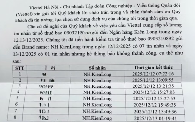 Cụ thể, dữ liệu xác nhận từ nhà mạng Viettel cho thấy, tại thời điểm xảy ra sự việc, chỉ có duy nhất một tin nhắn SMS được gửi đến số điện thoại của ông vào lúc 01h19 ngày 13/12/2025. Trong khi đó, theo nguyên tắc bảo mật thông thường, mỗi giao dịch chuyển tiền đều phải đi kèm một mã OTP riêng biệt. Với 11 giao dịch, lẽ ra phải có 11 mã OTP tương ứng.