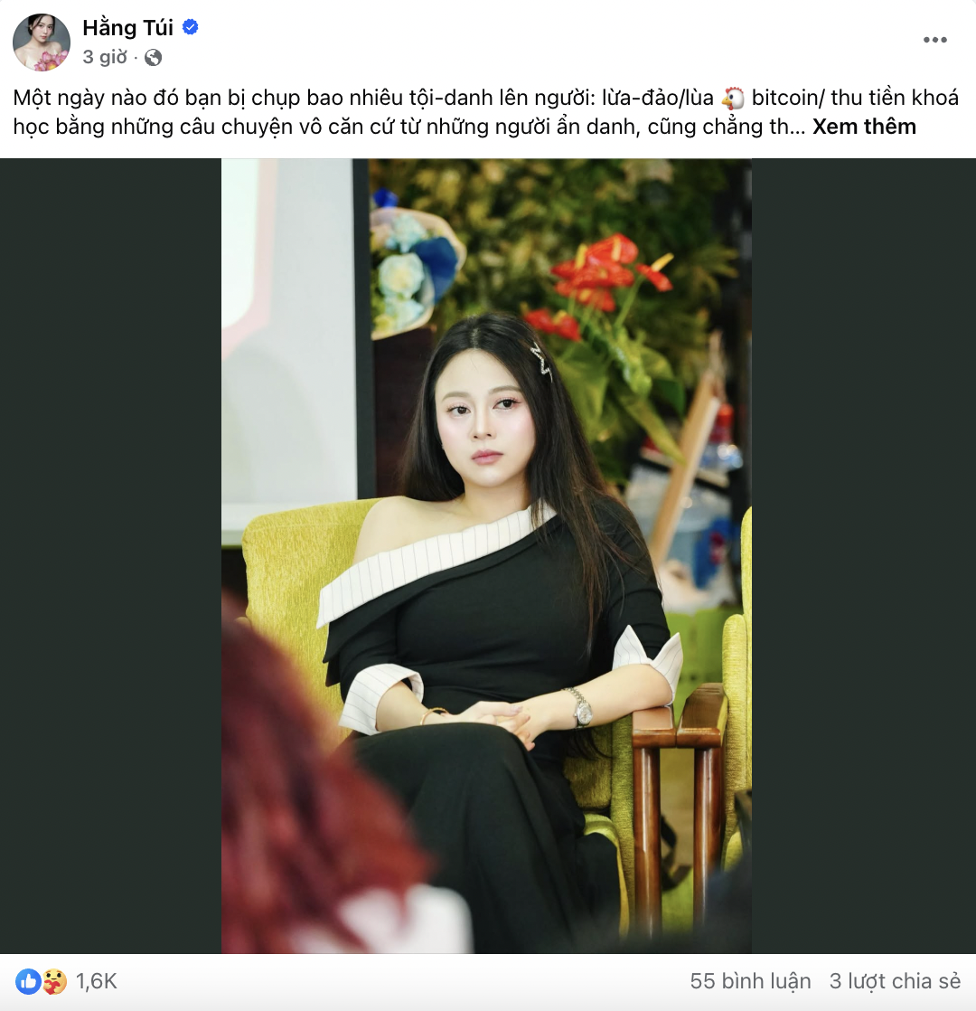 Trưa ngày 28/2, Hằng Túi đăng dòng trạng thái lên trên trên MXH về những thông tin mà cô cho là sai sự thật về bản thân mình. Cô khẳng định những lời tố về mình như "lừa đảo /lùa gà bitcoin/ thu tiền khoá học" là vô căng cứ, bị đồn thổi qua nhiều người, khiến công chúng hiểu sai về mình.