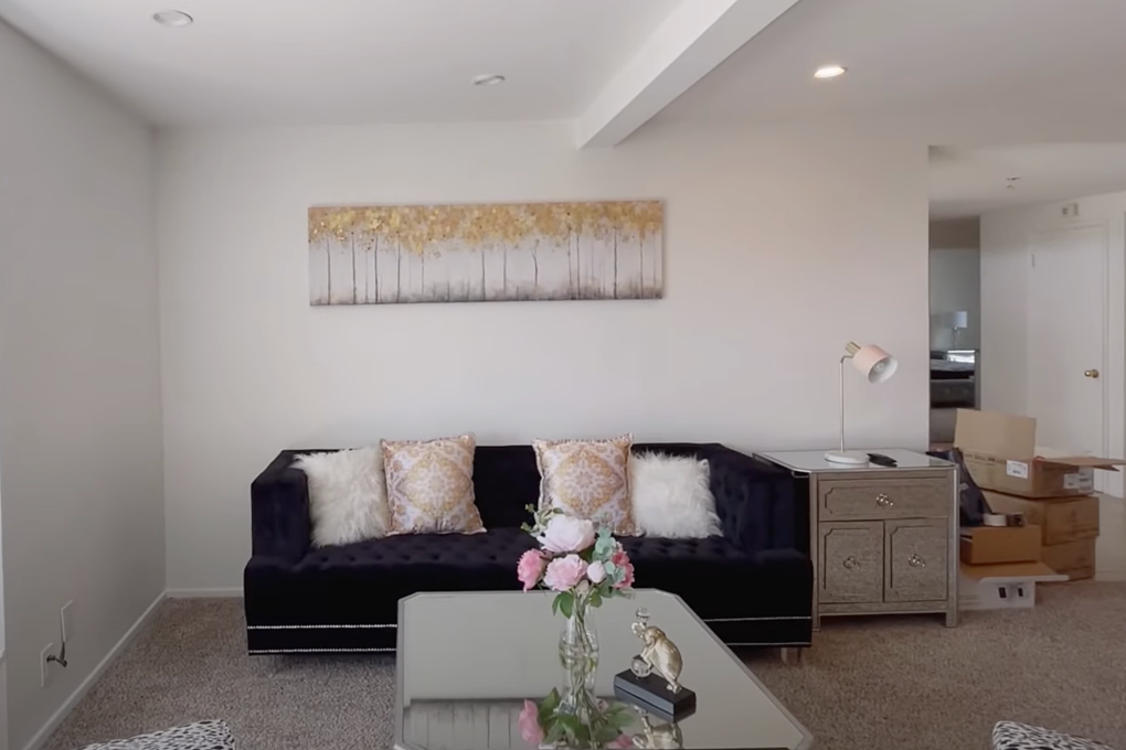 Khu vực phòng khách được bài trí sofa tông trầm, tranh và tủ cỡ nhỏ để đựng một số vật dụng cần thiết. Vì vừa mới dọn vào tổ ấm nên mọi thứ vẫn chưa được bài trí đầy đủ.