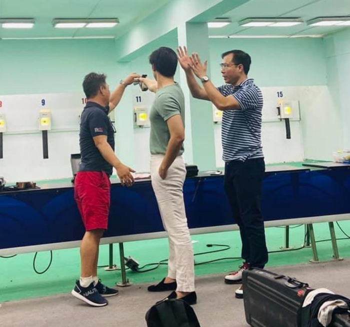 Chuyên gia Park Chung-gun và Xuân Vinh đang hướng dẫn Phúc Vinh tại trường bắn Nhổn