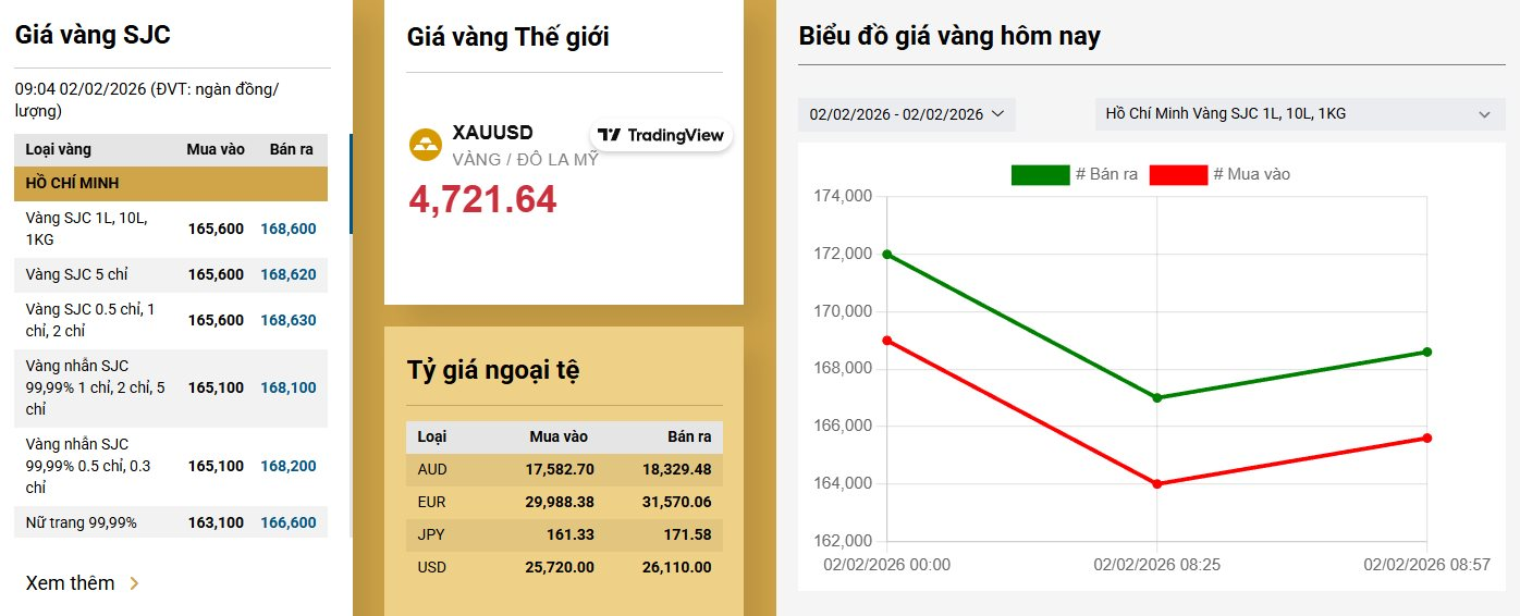 Tương tự, các loại vàng nhẫn SJC 99,99 cũng đồng loạt đi xuống. Loại từ 1 đến 5 chỉ có giá mua vào là 165,10 triệu đồng/lượng và bán ra là 168,10 triệu đồng/lượng, ghi nhận mức giảm khoảng 2,9 triệu đồng/lượng. Đối với vàng nữ trang 99,99%, mức giá hiện tại là 163,10 triệu đồng/lượng mua vào và 166,60 triệu đồng/lượng bán ra so với chốt phiên ngày 1/2.