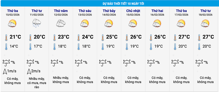 Sang hai ngày đầu năm Bính Ngọ 2026 (mùng 1 và mùng 2 Tết, 17-18/2), thời tiết khu vực này duy trì trạng thái có mây, không mưa, nhiệt độ cao nhất trong ngày phổ biến 27°C, thấp nhất 20°C.