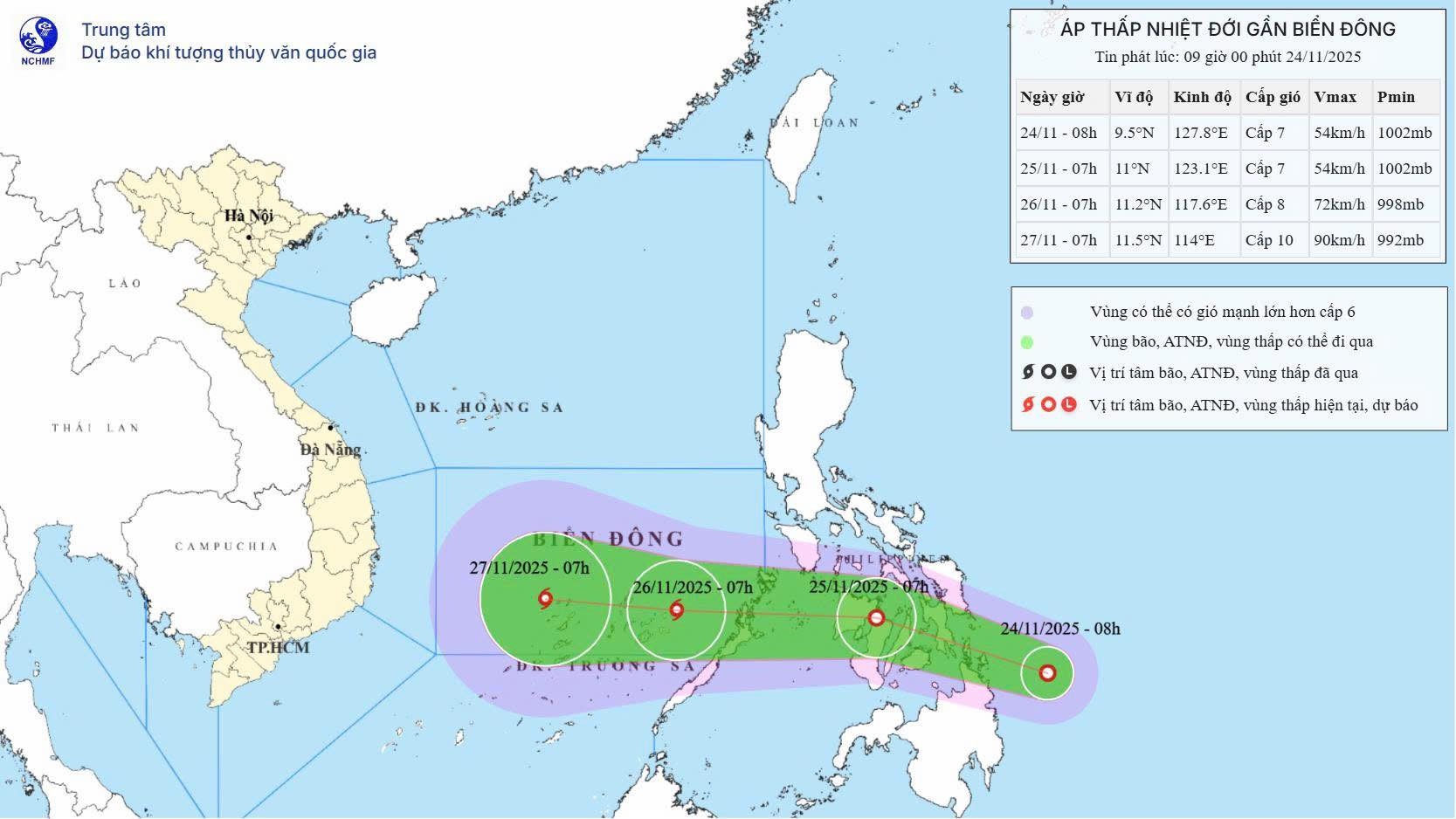 Dự báo khoảng đêm 25 rạng sáng 26/11, ATNĐ sẽ đi vào Biển Đông. Trong ngày 26/11, khi còn cách đất liền Nam Trung Bộ khoảng 1.000km, ATNĐ có khả năng mạnh lên thành bão.