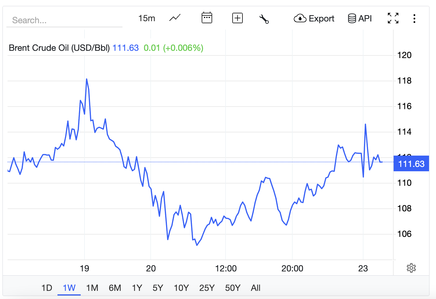 Trading Economics ghi nhận giá dầu Brent giao dịch quanh mức 112 USD/thùng vào thứ Hai sau khi tăng lên mức cao nhất là 115 USD vào đầu phiên giao dịch, khi các nhà đầu tư đánh giá tối hậu thư của Tổng thống Donald Trump thúc giục Iran mở lại eo biển Hormuz.
