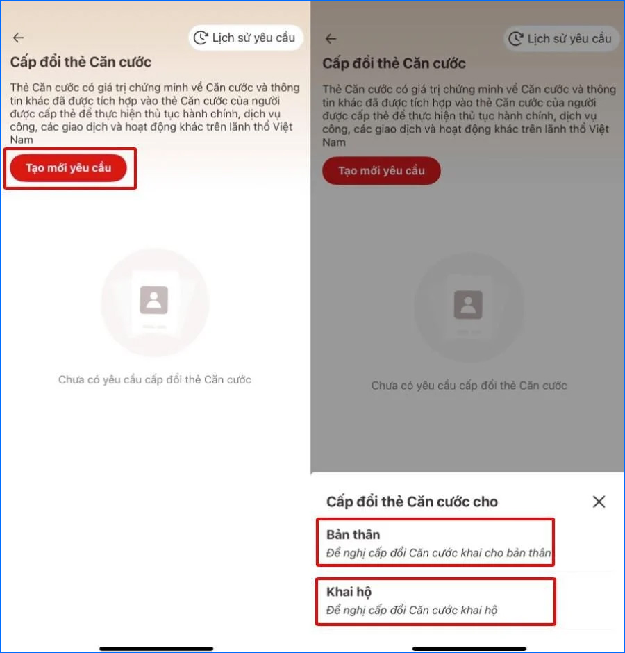Tại giao diện tiếp theo, bạn bấm nút đỏ Tạo mới yêu cầu. Lúc này hệ thống sẽ hỏi bạn muốn làm cho ai. Hãy chọn "Bản thân" nếu bạn đi đổi thẻ cho chính mình, hoặc chọn "Khai hộ" nếu làm giúp người thân (ví dụ con cái, cha mẹ già) nhé.