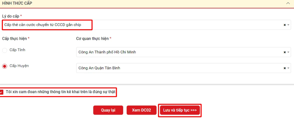Tiếp theo tick vào ô "Tôi xin cam đoan những thông tin kê khai trên là đúng sự thật", sau đó ấn chọn "Lưu và Tiếp tục".
