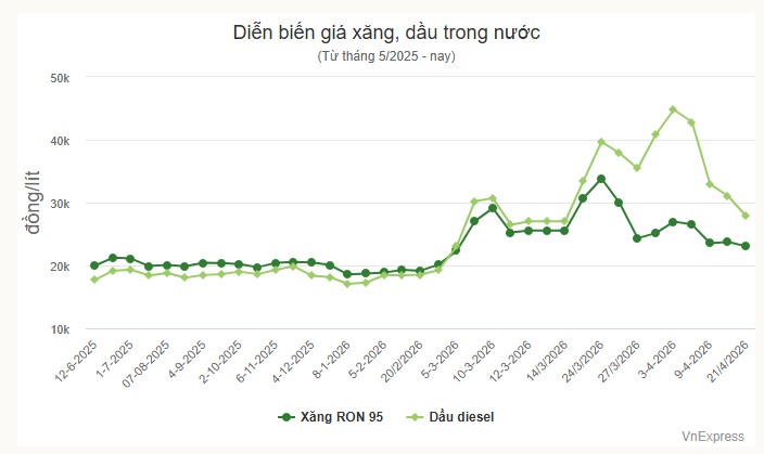 Theo cập nhật từ VNexpress, giá xăng dầu trong nước được điều chỉnh giảm từ 16h ngày 21/4, với mức giảm từ 660 đến 3.190 đồng mỗi lít hoặc kg tùy mặt hàng. Đây là lần giảm đồng loạt đối với cả xăng và dầu theo quyết định của cơ quan điều hành.