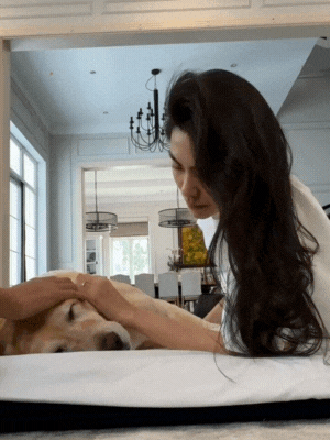Louis Nguyễn nhẹ nhàng vuốt ve Molly khi chú cún mệt mõi, nằm ra sàn (Ảnh: Instagram nhân vật)