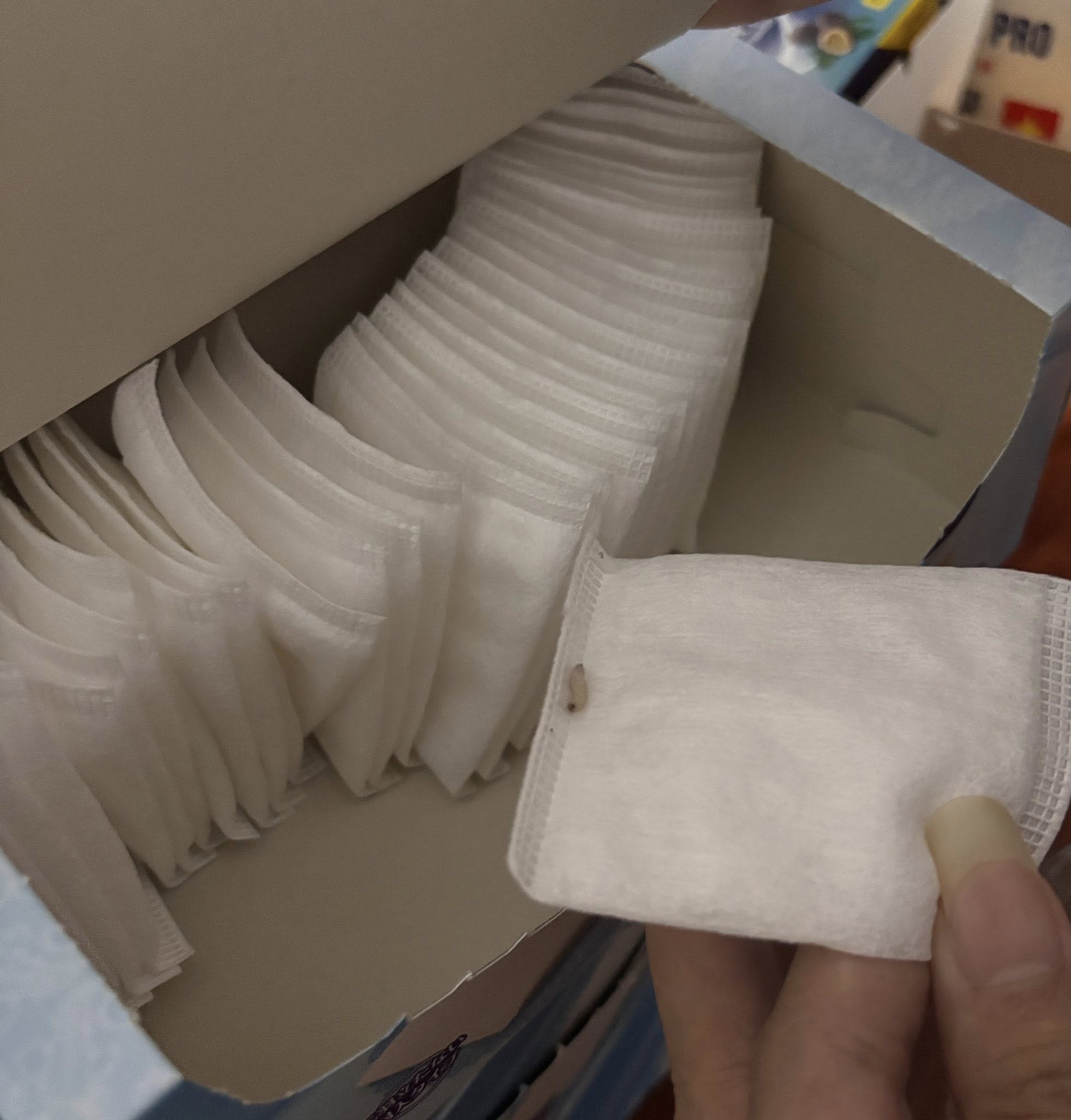 - Khách hàng này khẳng định đã loại trừ khả năng dòi xuất hiện do bảo quản tại nhà vì lý do "Nhà mình không nấu ăn, không có thức ăn thừa. Thời tiết Hà Nội dạo này lạnh và khô. Hộp bông để ở bàn trang điểm, khu vực sạch sẽ, khô ráo".