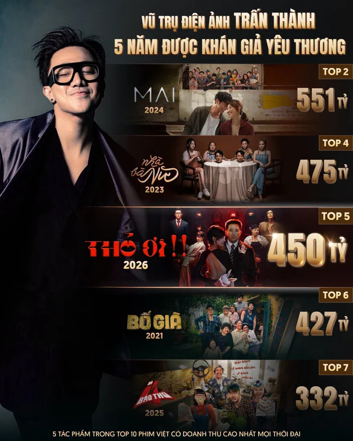 Trước đó, Trấn Thành đã có nhiều phim đạt doanh thu cao như Bố Già (427 tỷ đồng), Nhà Bà Nữ (475 tỷ đồng), Mai (551 tỷ đồng) và Bộ Tứ Báo Thủ (332 tỷ đồng). Tổng doanh thu 5 phim vượt 2.200 tỷ đồng, đưa anh trở thành đạo diễn có doanh thu cao nhất phòng vé nội địa.