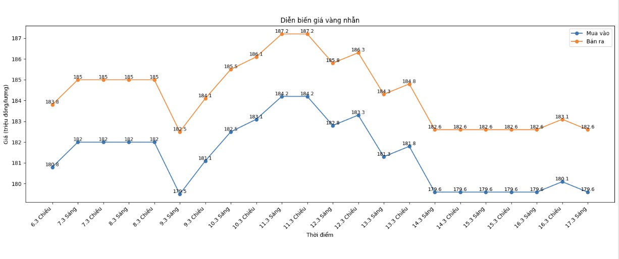 Cùng thời điểm, Tập đoàn DOJI niêm yết giá vàng nhẫn ở ngưỡng 179,6-182,6 triệu đồng/lượng (mua vào - bán ra), đi ngang cả hai chiều mua vào và bán ra. Chênh lệch giá mua vào - bán ra ở ngưỡng 3 triệu đồng/lượng.