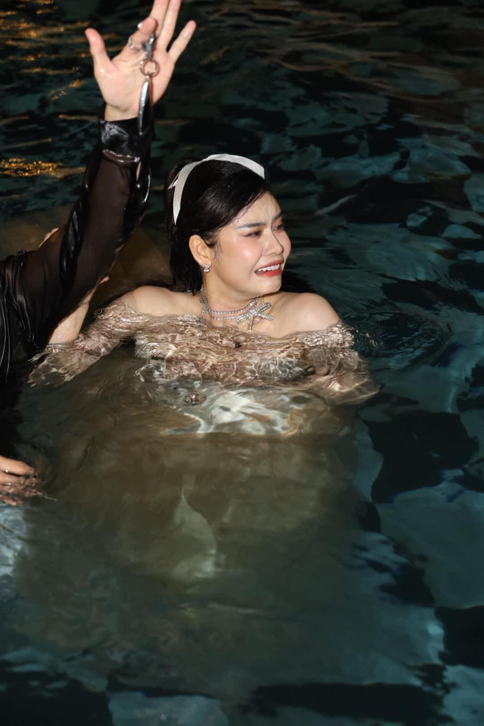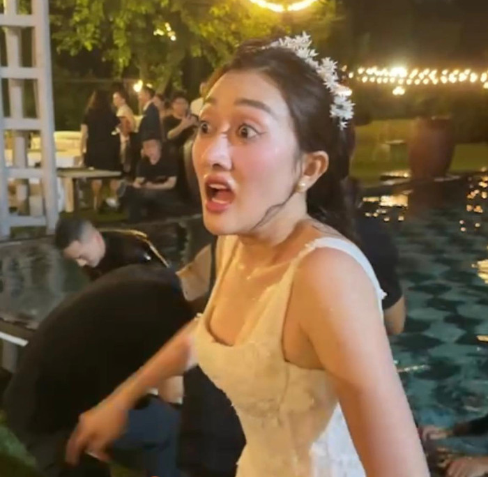 Ngay cả cô dâu Phương Lan cũng không tránh khỏi "kiếp nạn" bể bơi này.