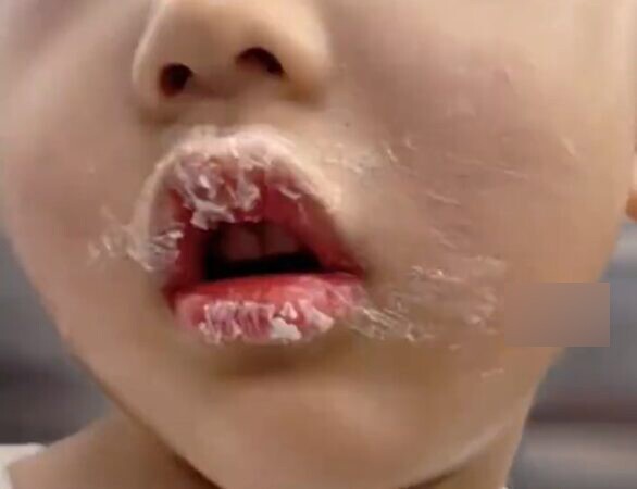 Vì keo chưa kịp khô hoàn toàn nên môi đứa trẻ không bị dính chặt, cũng không bị rách.