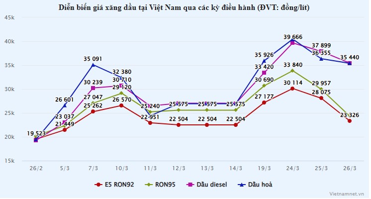 Xăng, dầu diesel và nhiên liệu bay được áp dụng thuế bảo vệ môi trường 0 đồng, thuế tiêu thụ đặc biệt 0% và không phải kê khai, tính thuế giá trị gia tăng. Nhờ đó, giá xăng dầu đồng loạt giảm mạnh trong kỳ điều hành đêm 26/3.