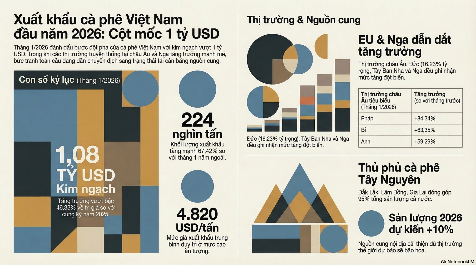 Theo số liệu thống kê sơ bộ của Cục Hải quan Việt Nam, xuất khẩu cà phê của Việt Nam trong tháng 1/2026 đạt hơn 224 nghìn tấn, thu về 1,08 tỷ USD, với giá trung bình 4.820 USD/tấn. Với con số trên, xuất khẩu nhóm hàng này của nước ta tăng 22,62% về lượng, tăng 14,06% về trị giá so với tháng 12/2025; tăng mạnh 67,42% về lượng, tăng 48,33% về trị giá so với cùng tháng năm ngoái.