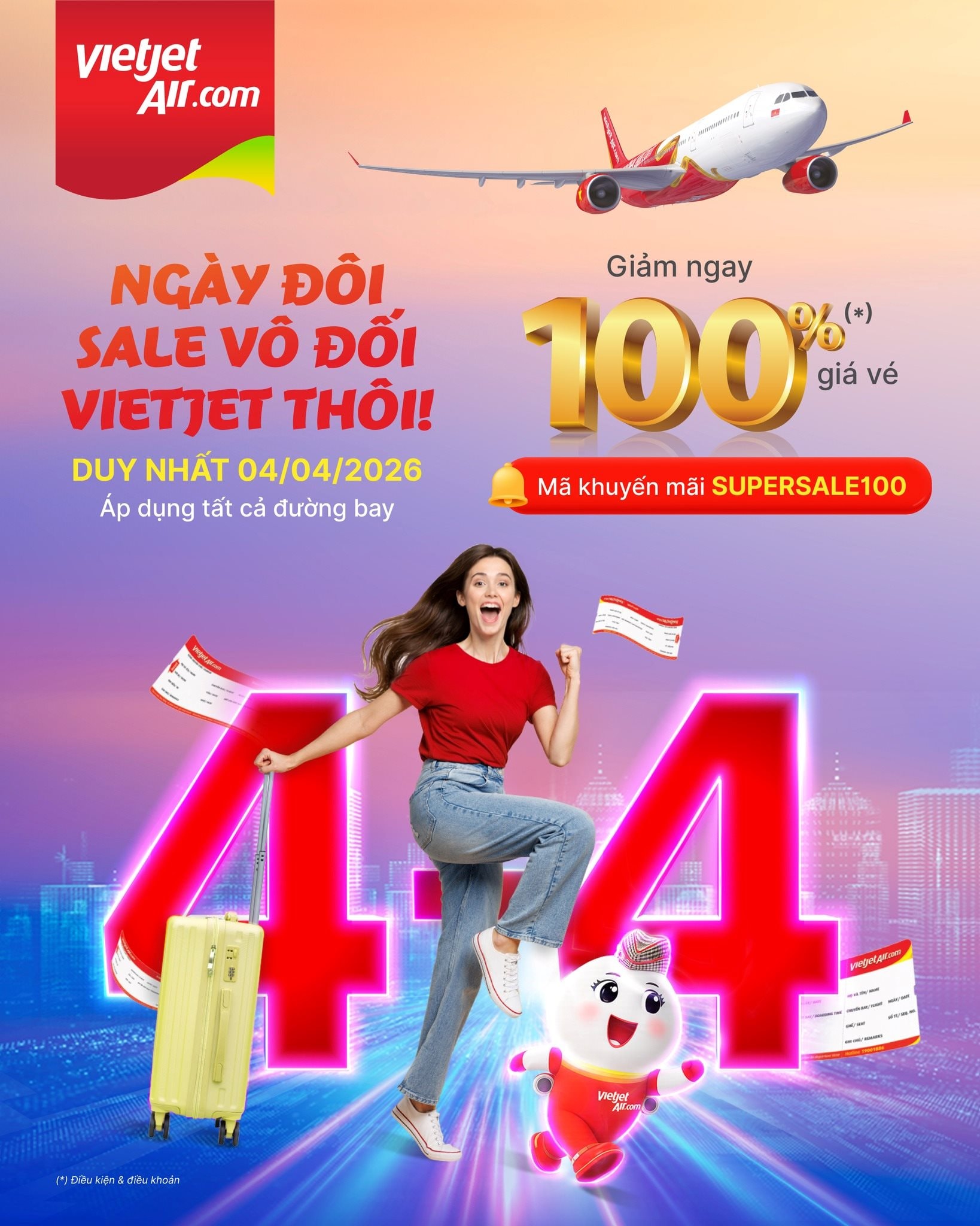 Chương trình được triển khai từ 0h00 đến 23h00 ngày 4/4/2026, áp dụng cho toàn bộ hành trình bay do Vietjet khai thác. Hành khách có thể đặt vé thông qua website chính thức, ứng dụng di động hoặc các kênh bán vé trực tuyến của hãng.