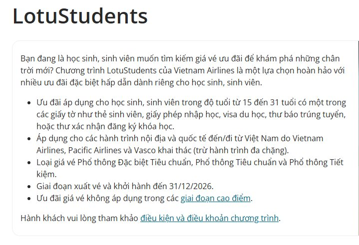 Vietnam Airlines vừa chính thức tung ra một chương trình ưu đãi mang tên LotuStudents kéo dài đến hết năm 2026. Đây là chương trình giúp học sinh, sinh viên và du học sinh tối ưu hóa tối đa chi phí trên mỗi chuyến bay nội địa lẫn quốc tế, đồng thời tận hưởng hàng loạt đặc quyền hấp dẫn từ hãng hàng không quốc gia. Tăng chuyến bay, tàu hỏa đi các điểm du lịch dịp 30/4-1/5 Tin cực vui cho các hãng bay và khách đặt vé chính thức áp dụng từ 7/4 đến 30/6 Cấp cứu khách nữ trên chuyến bay từ Việt Nam đi Nhật, kịch tính như trong phim