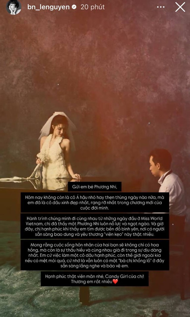 Hành trình chứng minh đi cùng nhau từ những ngày đầu ở Miss World Vietnam, chị đã thấy một Phương Nhi luôn nỗ lực và ngọt ngào. Và giờ đây, chị hạnh phúc khi thấy em tìm được bến đỗ bình yên, nơi có người sẵn sàng bao dung và yêu thương “viên kẹo” này thật nhiều.