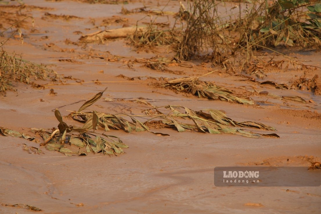 Khối bùn đặc sệt theo dòng chảy tràn xuống khu dân cư, vùi lấp đường đi, sân vườn và ao cá của hàng chục hộ dân hai xóm Gốc Thị, Ao Sen.