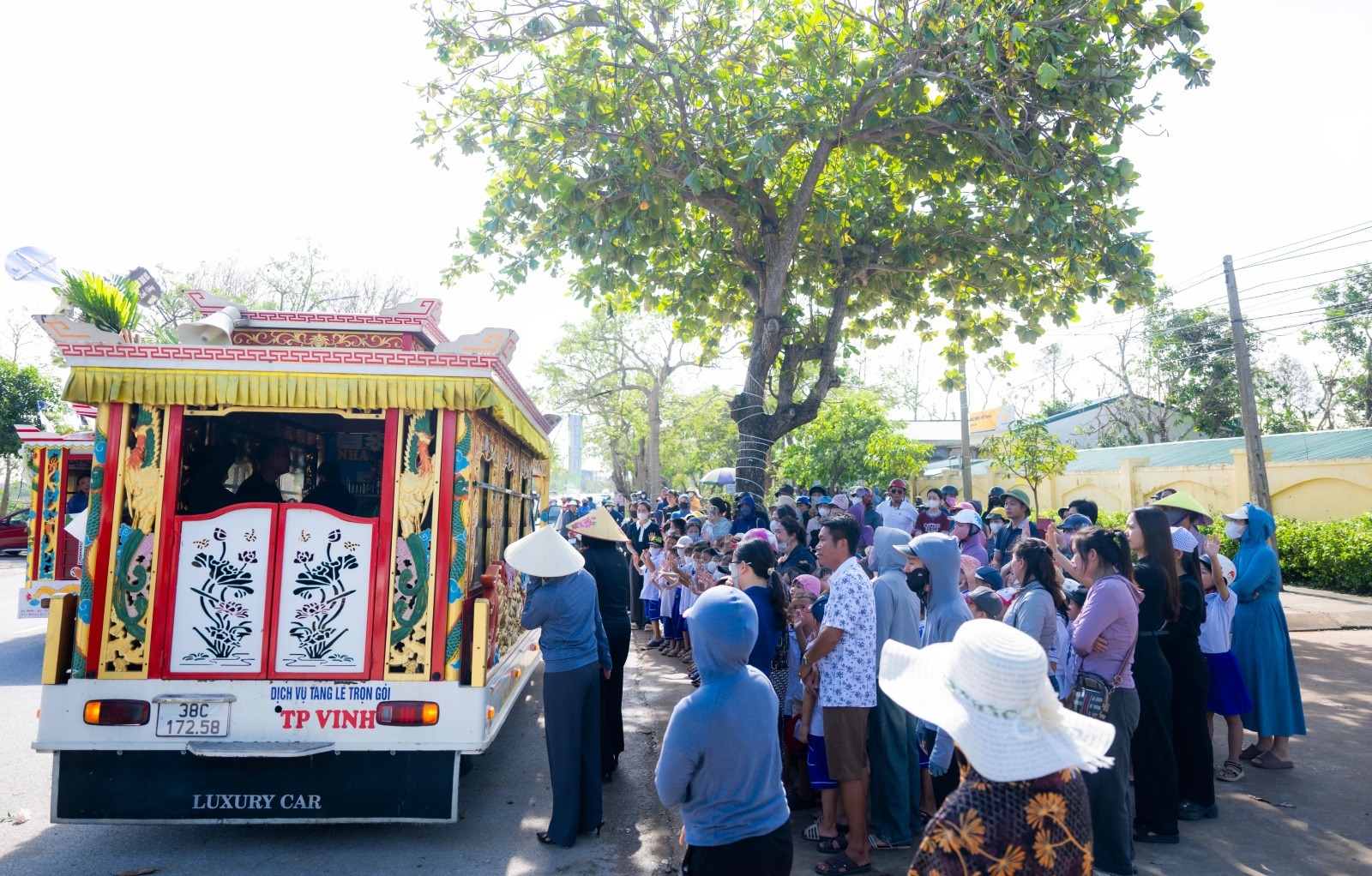 Khi đoàn xe tang đi ngang qua cổng trường, các thầy cô, bạn học và phụ huynh đồng loạt vẫy tay chào tạm biệt em. Tiếng khóc nấc nghẹn ngào vang lên, nhiều người không kìm được nước mắt trước hình ảnh tiễn biệt đầy thương cảm.