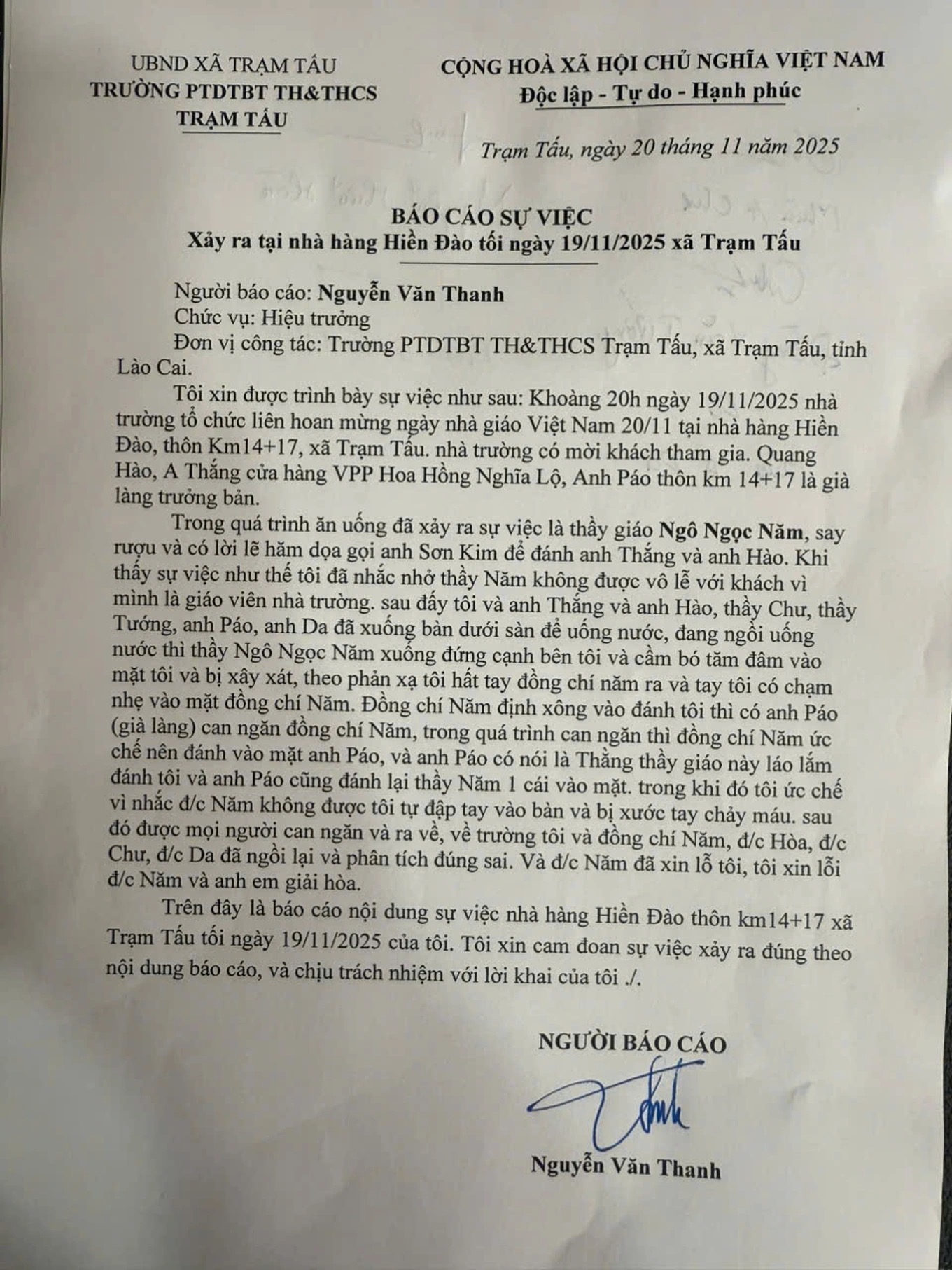 Được biết, người đăng sự việc lên mạng xã hội là ông Ngô Ngọc Năm, giáo viên Trường Phổ thông dân tộc bán trú TH&THCS Trạm Tấu (xã Trạm Tấu, tỉnh Lào Cai). Ông Năm tố bị ông Nguyễn Văn Thanh, Hiệu trưởng Trường Phổ thông dân tộc bán trú TH&THCS Trạm Tấu hành hung.