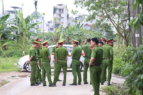 Hơn 20 cảnh sát mặc sắc phục cùng đại diện viện kiểm sát, nhân viên y tế đã tham gia khám nghiệm hiện trường trong gần một tiếng. Một người đàn ông mặc áo đen với tay bị còng được đưa xuống từ ôtô công vụ. Người này vác theo một bao tải, sau đó ném xuống bụi chuối.