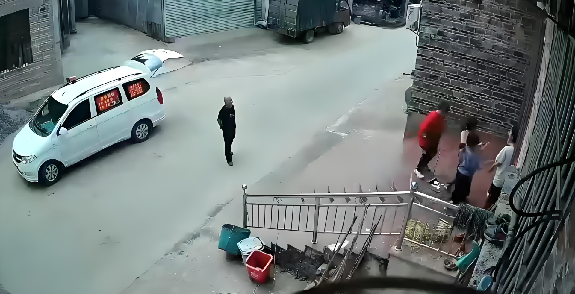Theo những gì camera ghi lại, trước cổng nhà lúc đó có vài đứa trẻ đang đứng chơi. Mọi thứ vẫn bình thường cho đến khi một người đàn ông mặc đồ đen bất ngờ bước xuống từ một chiếc ô tô đỗ bên kia đường. Chiếc xe gây chú ý vì cửa kính tối màu, thân xe dán đầy quảng cáo và cốp sau mở rộng. Thấy người lạ tiến lại gần, đám trẻ lập tức tỏ ra cảnh giác, nhanh chóng chạy vào trong nhà và đóng chặt cổng.