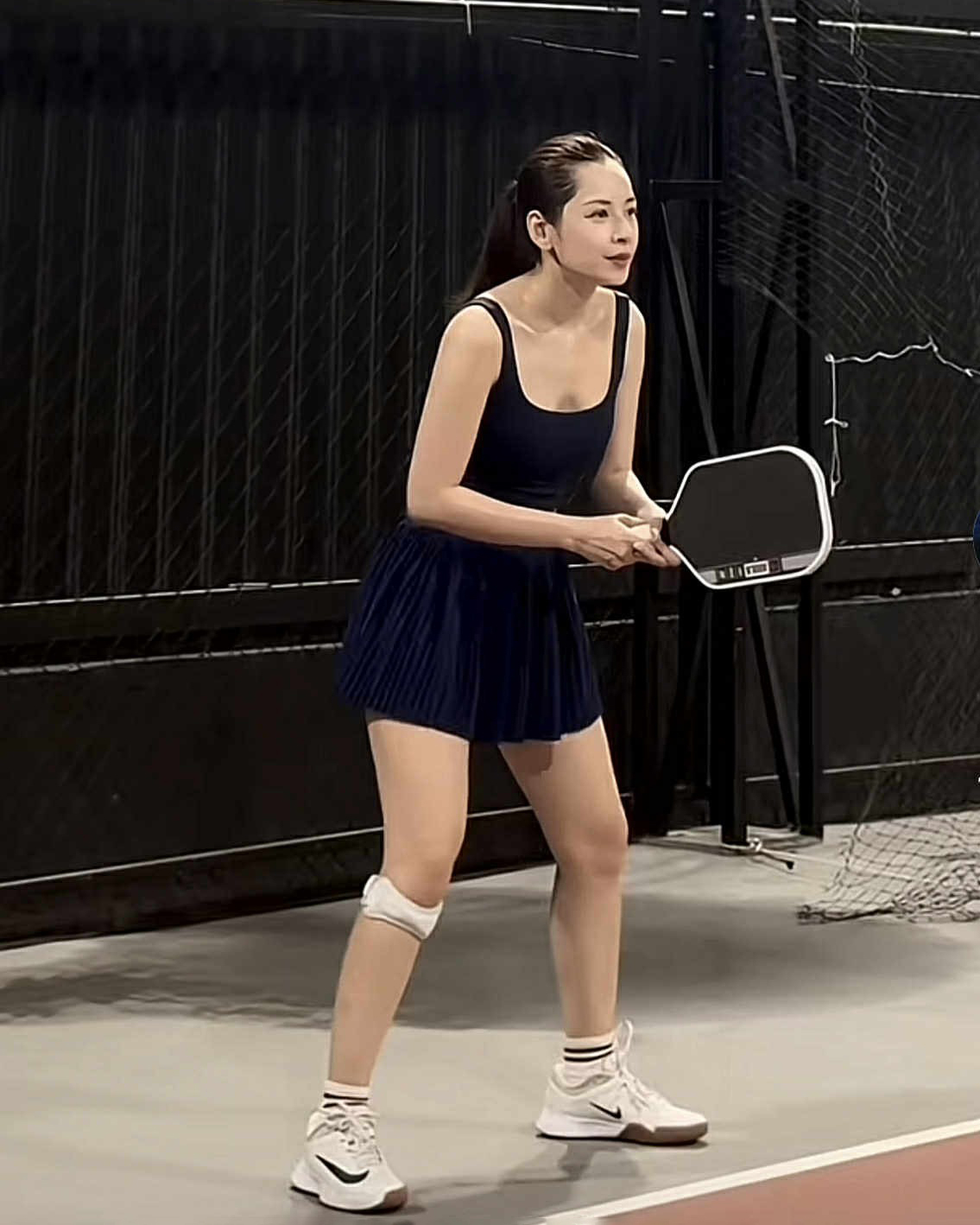 Chi Pu cho biết chỉ cần khoảng một tháng tập luyện chăm chỉ, cô đã đánh bóng khá nhuần nhuyễn. Một video đi chơi pickleball khác của người đẹp với bộ trang phục màu xanh than hở cổ sâu cũng hút hàng triệu lượt xem.