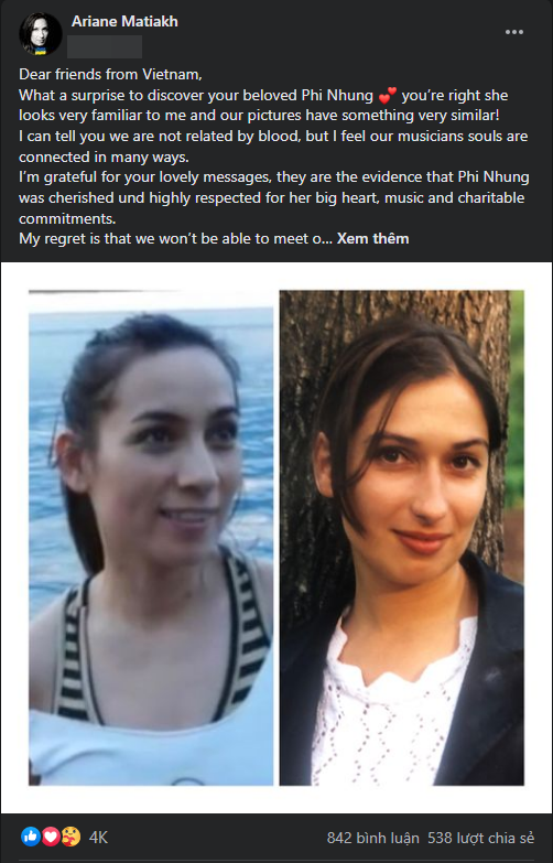 Ngay khi nhận được tình cảm của khán giả Việt, Nữ nhạc trưởng tên Ariane Matiakh viết: "Dear friends from Vietnam, what a surprise to discover your beloved Phi Nhung you're right she looks very familiar to me and our pictures have something very similar! I can tell you we are not related by blood, but I feel our musicians souls are connected in many ways. I'm grateful for your lovely messages, they are the evidence that Phi Nhung was cherished und highly respected for her big heart, music and charitable commitments. My regret is that we won’t be able to meet on earth and I'm very very sorry for your painful loss… My prayers for her and warmest thoughts for her family, friends and fans…"